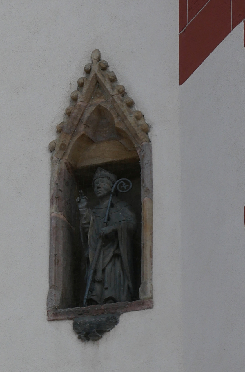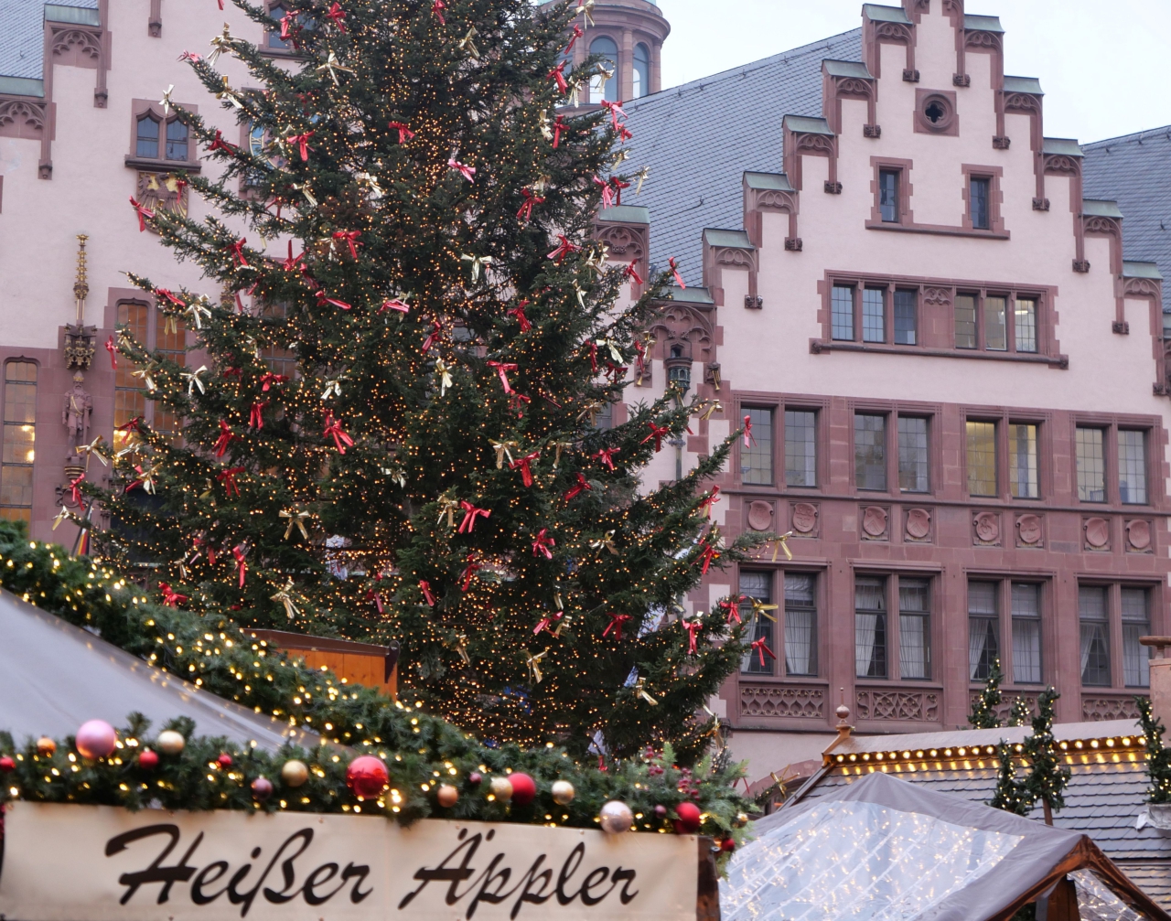 Das Ziel der Wanderung, die dem Heiligen gewidmete Nicolaikirche auf dem Römerberg, steht im Weihnachtsmarktgewühl. In der Wand ist eine Nikolausfigur eingelassen, Blickrichtung Römerberg. Nur spuckt Nikolaus keine Galle, holt noch nicht mal zu Ohrfeige aus. Stattdessen gilt all den Buden, Lebkuchen, Lichtern, Menschen, Maiskolben, Mandeln, dem Kinderkarussell und dem Weihnachtsbaum seine segnende Geste.