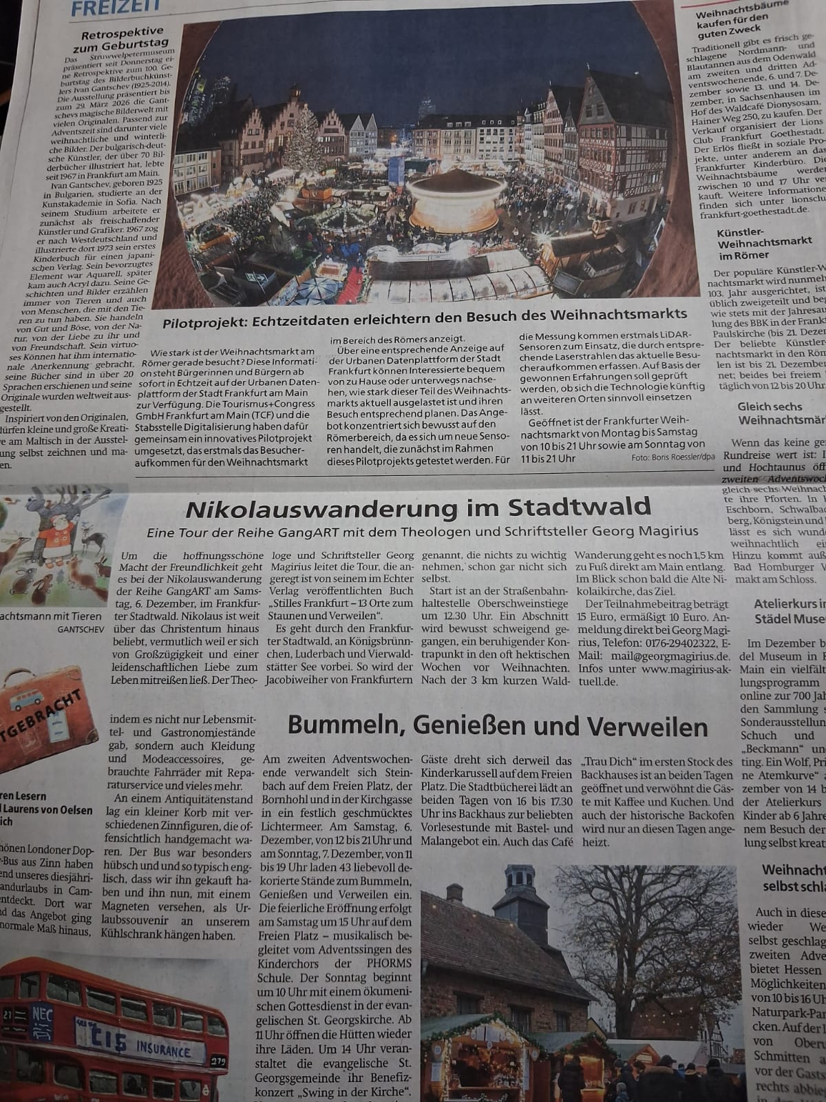 Ansichten wirbeln durcheinander. Gewohntes steht Kopf. Und was sonst nicht geht, geht gut. Das macht die revolutionäre Kraft der Freundlichkeit. Ihr geht am Nikolaustag 2025 in Frankfurt am Main eine Tour der Reihe GangART unter Leitung des Theologen und Schriftstellers Georg Magirius nach. 16 Pilgerinnen und Wanderer der ausgebuchten meditativen Wanderung nähern sich einem Heiligen, “der weit über das Christentum beliebt ist”, kündigen FAZ, FR und FNP vom 6. Dezember 2025 und auch das überregional ausgerichtete Portal Theology.de die Tour an: “Vermutlich weil Nikolaus sich von Großzügigkeit und einer leidenschaftlichen Liebe zum Leben mitreißen ließ.”
