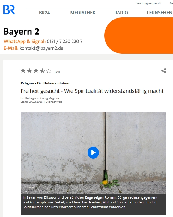 Die Sendung “Freiheit gesucht. Wie Spiritualität widerstandsfähig macht” von Georg Magirius ist in der Reihe “Religion – Die Dokumentation” für Bayern2 produziert worden. Sie ist jetzt hier auf der Website von BR2 zu hören. Neben Ralf-Uwe Beck sind an der Sendung die Meditationsanleiterin Karin Seethaler aus Regensburg und die Schriftstellerin Sigrid Katharina Eismann aus Hanau. Zu hören ist die Sendung kostenfrei hier in der BR-Audiothek. Die Redaktion hat Dr. Matthias Morgenroth, Regie Sabine Kienhöfer. Sprecherin ist Julia Fischer, das Produktionsmanagement liegt bei Ingrid Schillinger.